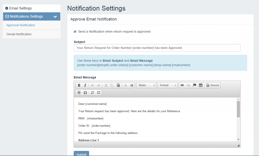 The App generates a RMA number as soon as the **Request is “Approved”.**  So in order to automatically send the RMA number by email , simply include it in the Approval Notification Email.  The customer will get the Approval Email with RMA number and all other information.