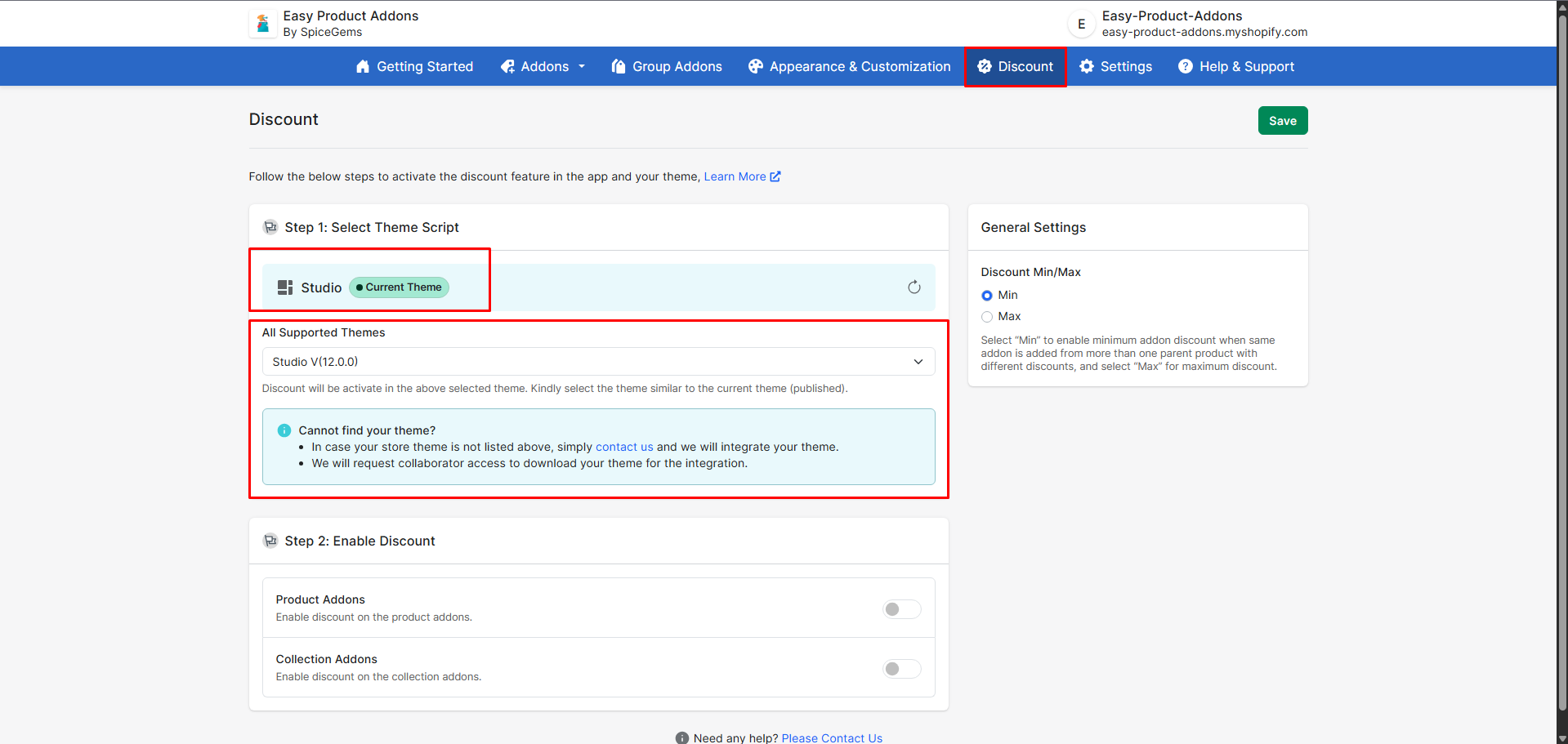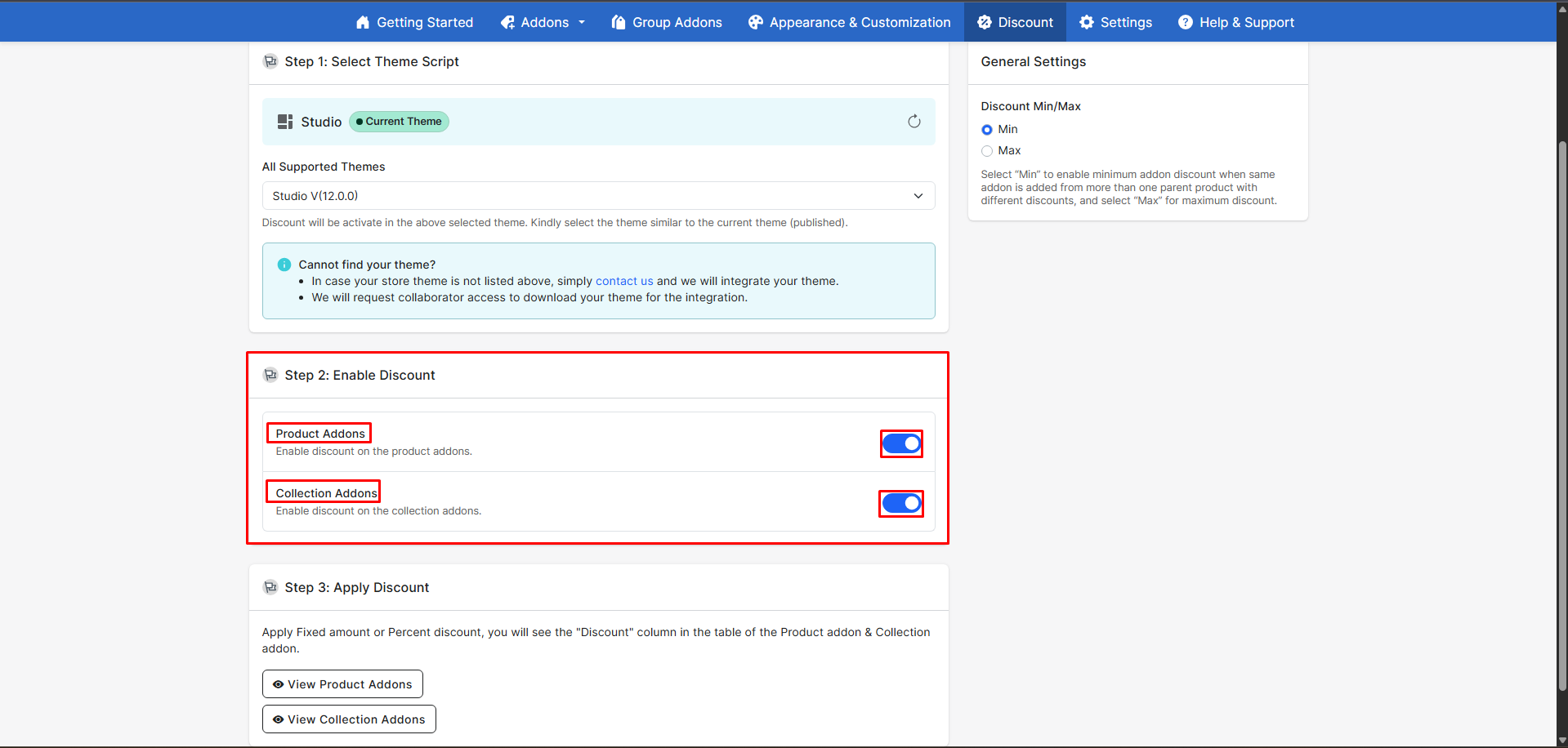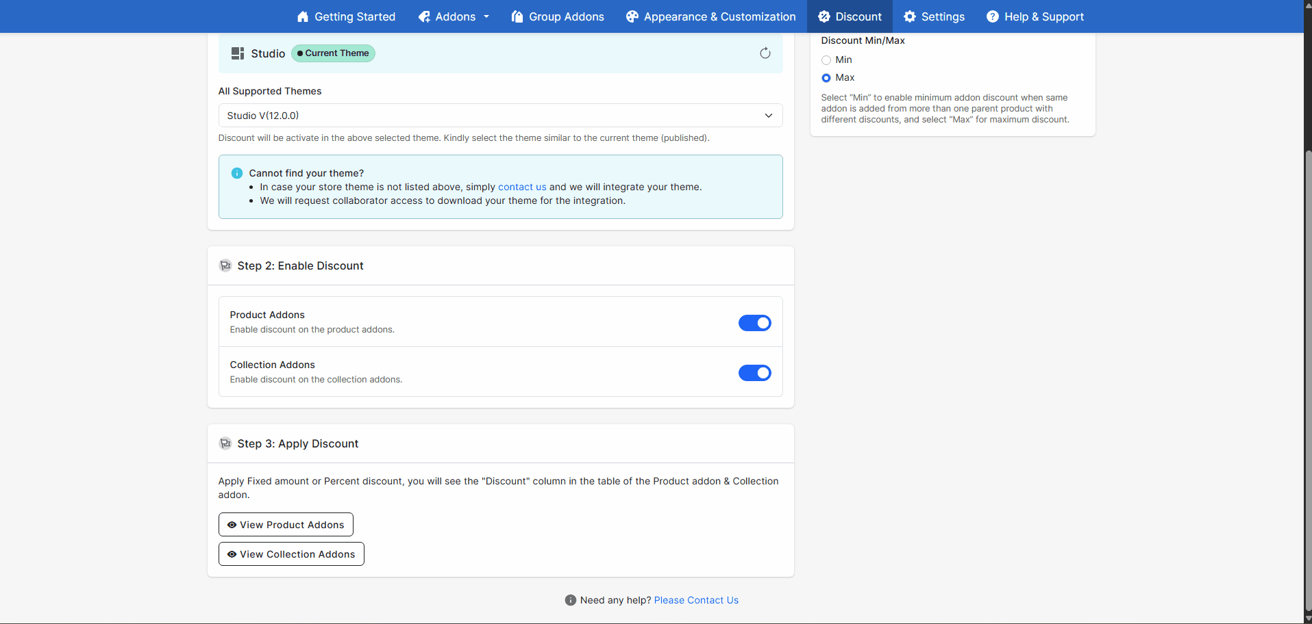 Once you've activated the discount feature for the desired options, you can set minimum and maximum discount limits for the addon products using the [**Min-Max setting**](https://help.spicegems.com/epa-easy-product-addons/apply-discount-on-the-add-ons/min-max-setting)**.**