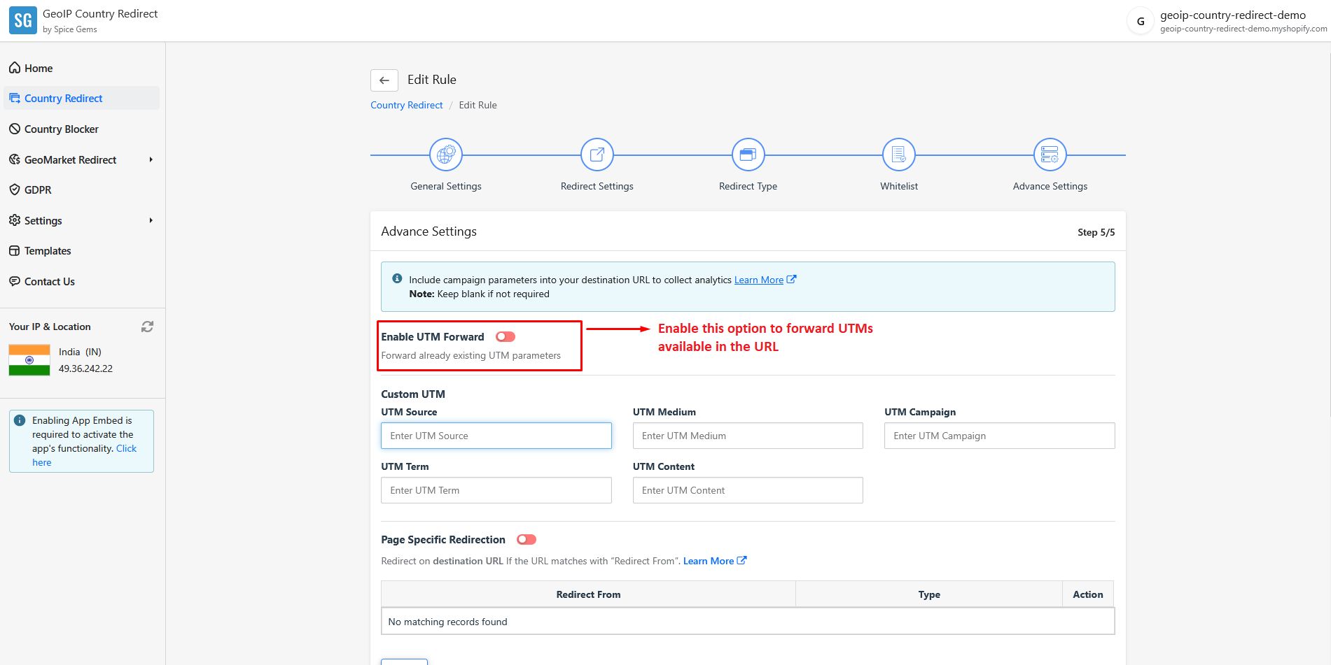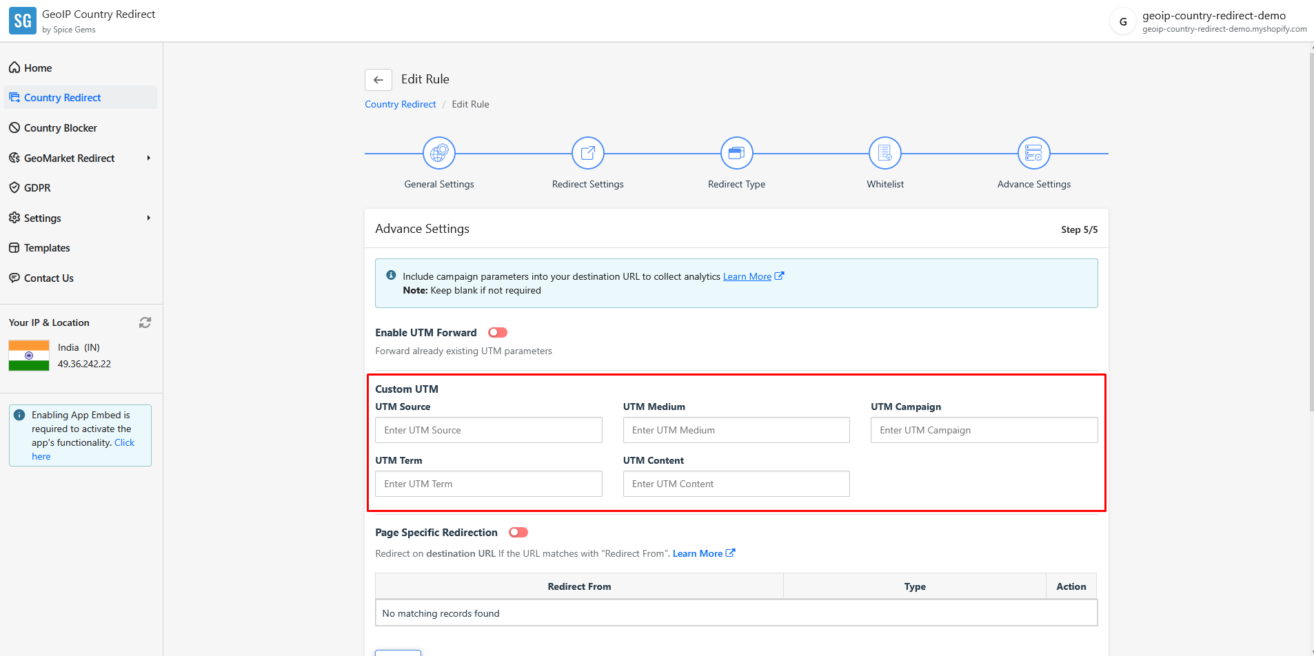 2. This is the URL with the UTM parameters: *<mark style="color:blue;">`https://spicegems.com?utm_source=GeoIP_Country_Redirect&utm_medium=US_Redirect_Rule&utm_campaign=popup`</mark>*