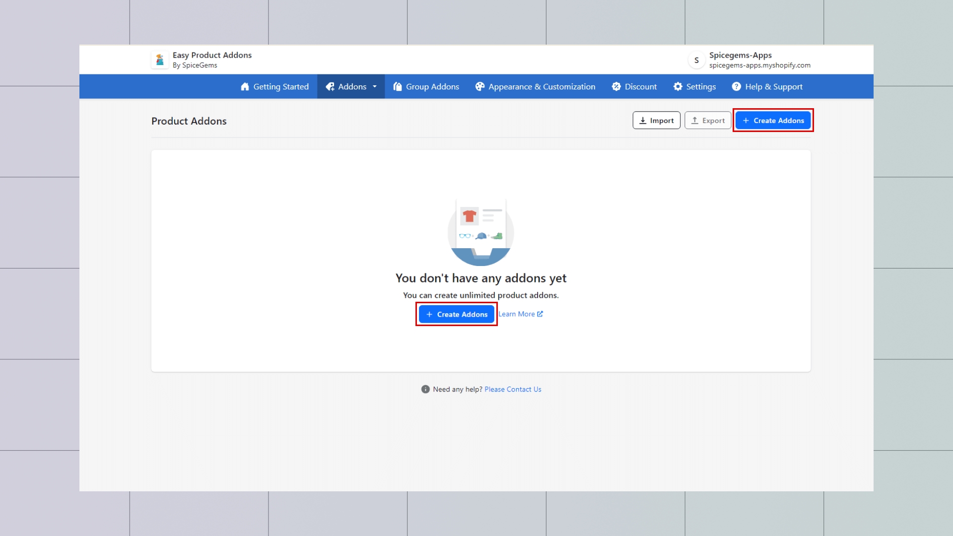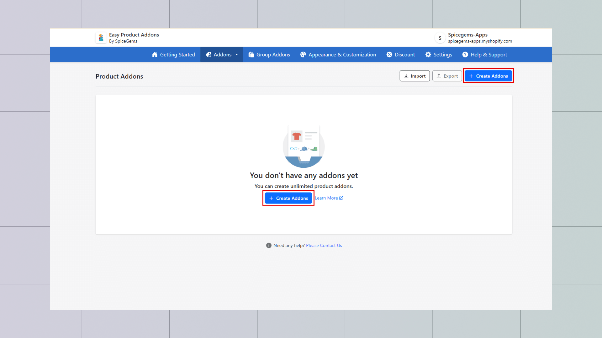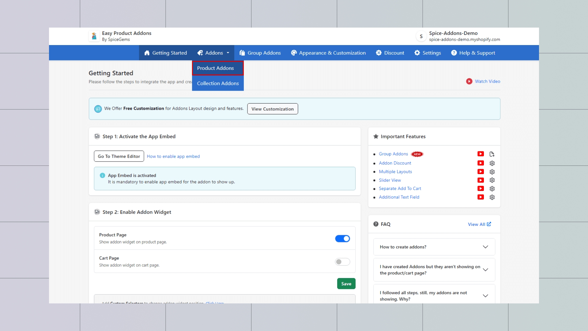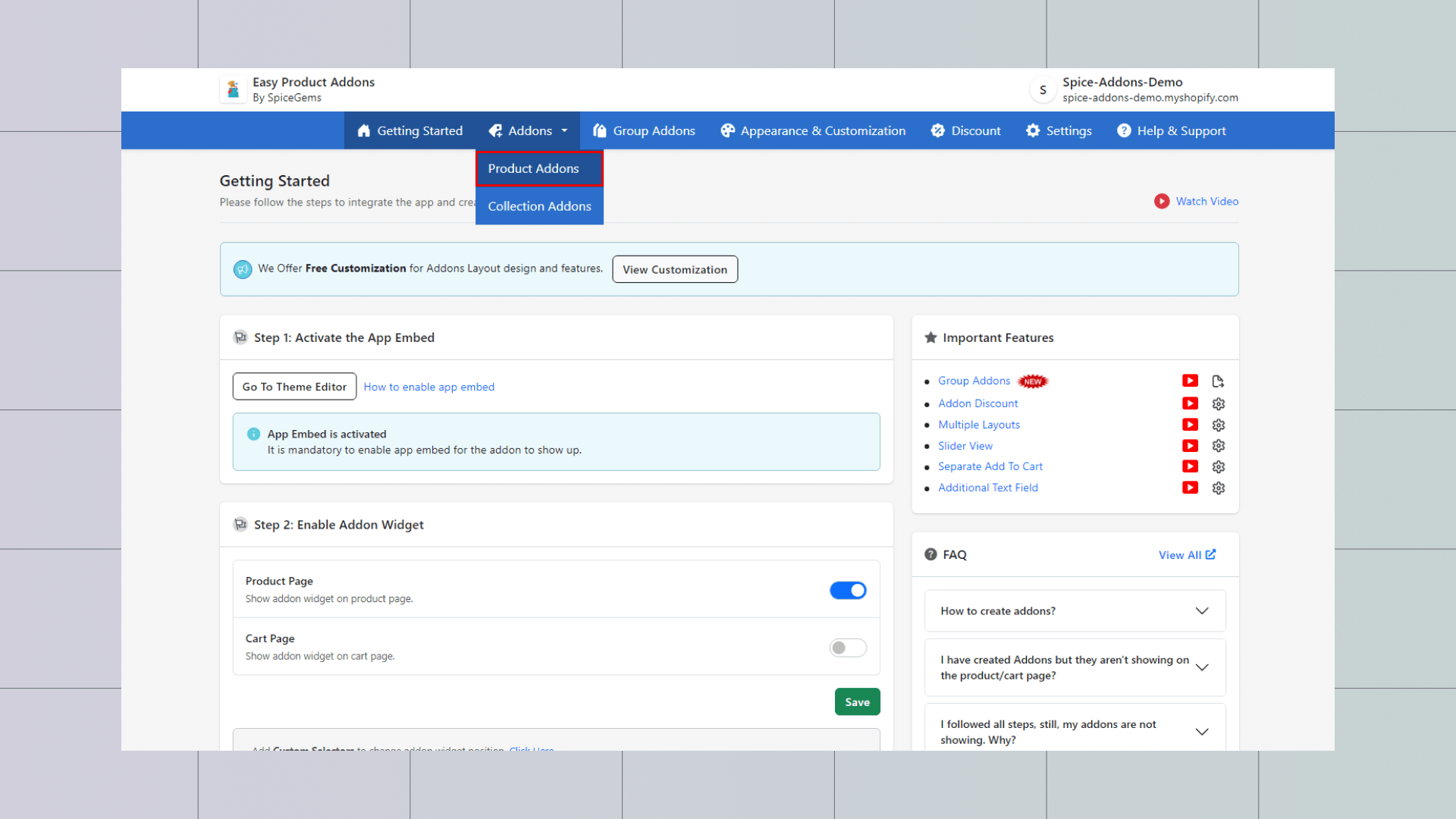 Step 1: On the Getting Started Page → Click on Addons Tab – Choose either Product Addons or Collection Addons