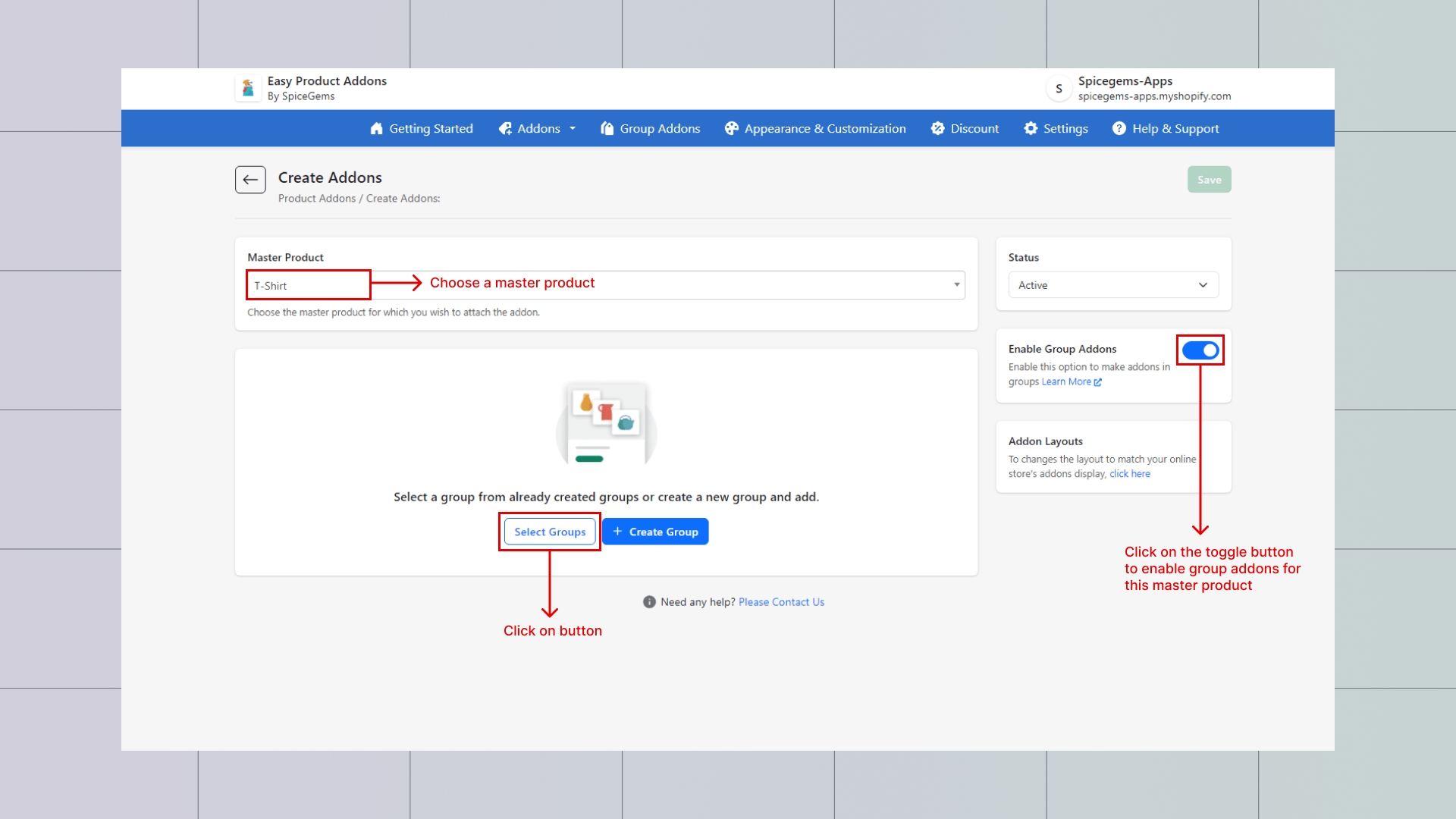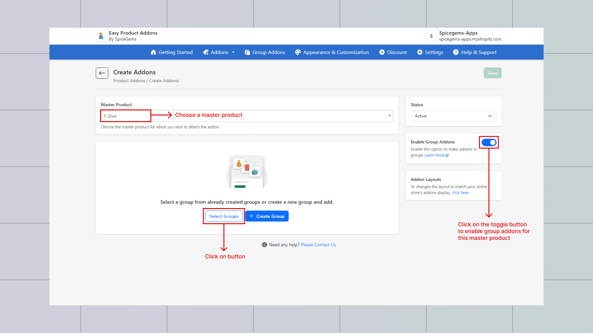 Step 3: Select Master Product → Enable Group Addon (on the left – Toggle to enable)