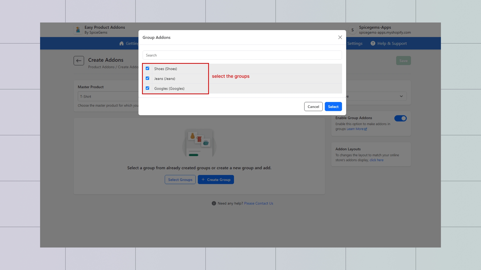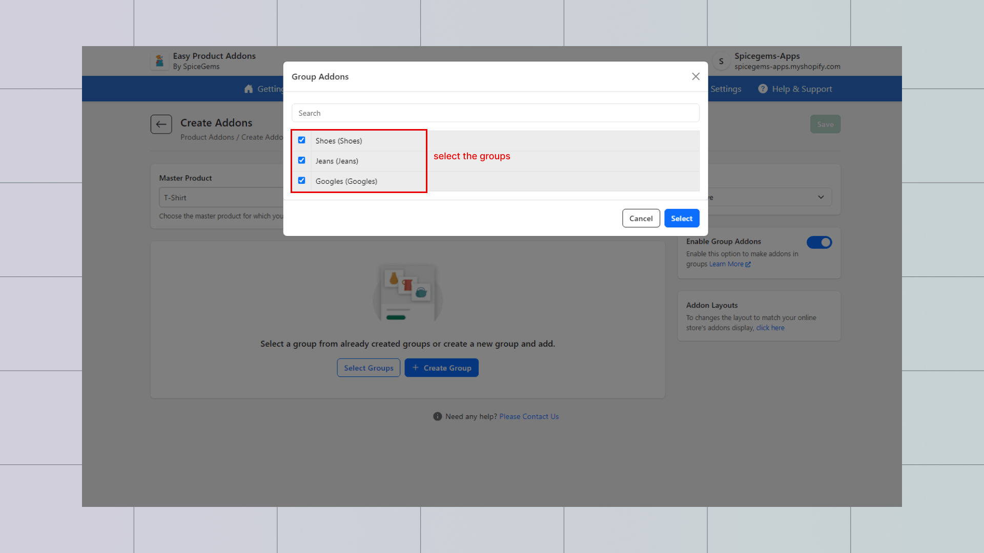 Step 4: On activating the Group Addons, you will see an option to Select Groups (as per the above snapshot) → Choose the required Groups (already created groups – if not created, click here) → click Select